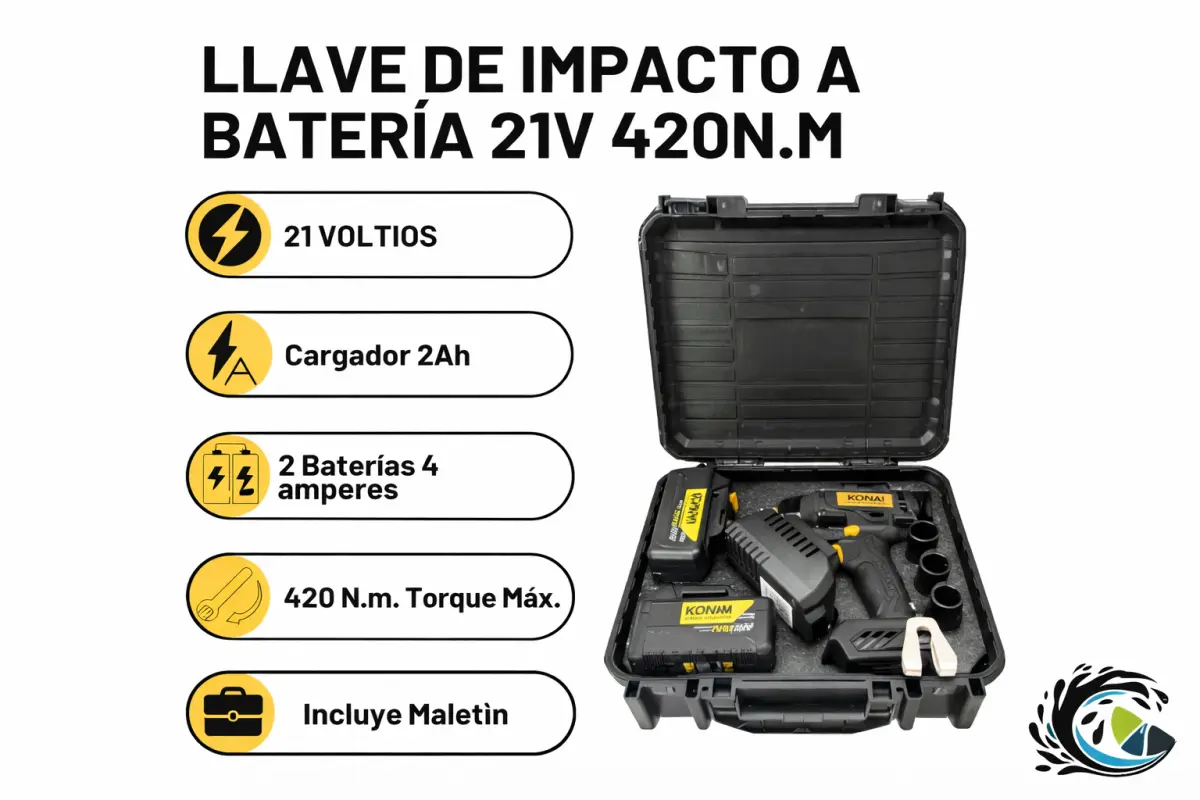 La Llave de Impacto Konan XPV 21V combina fuerza, autonomía y comodidad para profesionales exigentes. Su torque de 420 Nm y motor sin carbones permiten realizar cualquier tarea con eficiencia y control, mientras que las baterías de larga duración y el cargador rápido aseguran que el trabajo nunca se detenga.
