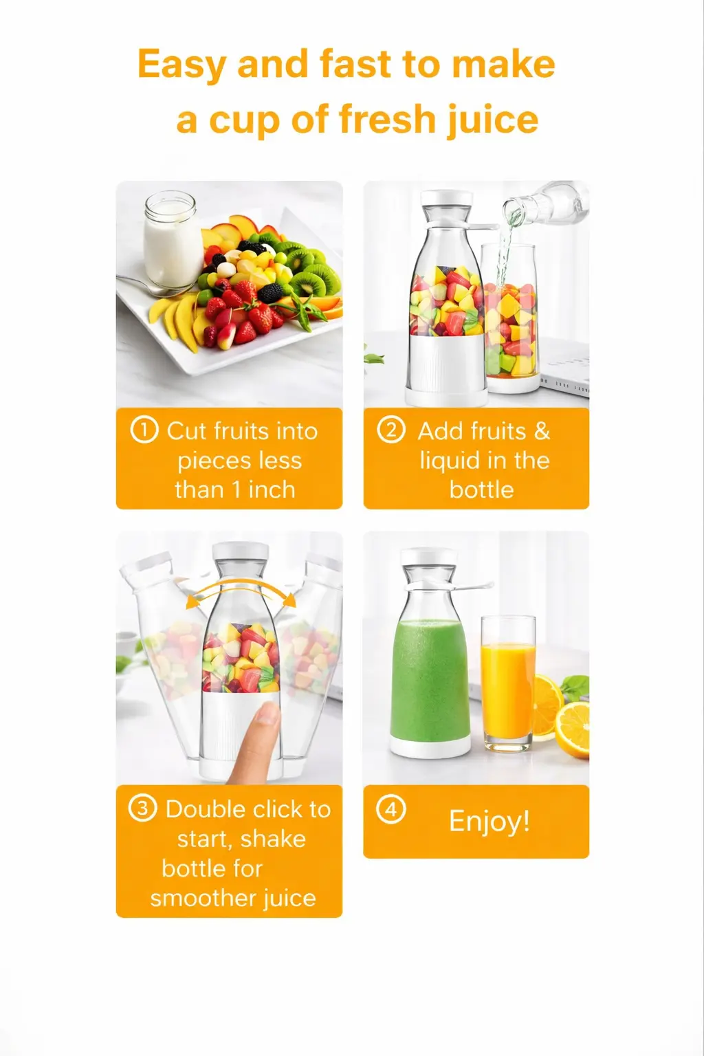 La Mini Licuadora Portátil USB es perfecta para preparar licuados, batidos, jugos y smoothies en cualquier lugar. Compacta, liviana y fácil de llevar, es ideal para quienes buscan una opción práctica para el gimnasio, la oficina, viajes o uso diario.